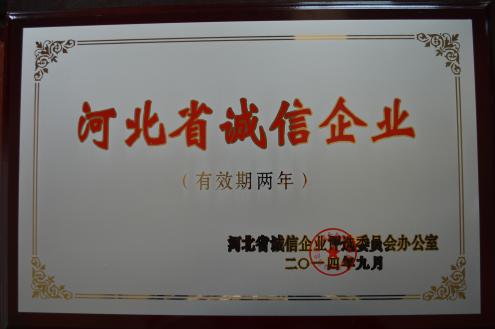 为深入贯彻落实科学发展观,大力倡导诚实守信光荣、见利忘义可耻的良好风尚,进一步推动企业诚信建设,规范以诚信生产、诚信经营为核心的市场经济秩序,从2007年开始,经省有关领导批准,由省委、省政府有关部门和省级相关社团等单位参与开展的“河北省诚信企业”评选活动,对我省企业诚信建设起到了推动作用,得到省领导和社会各界的好评,产生了良好的社会影响。经批准,2014年在河北省社会信用体系建设领导小组办公室领导下,继续开展“河北省诚信企业”创建及评选表彰活动。9月26日,“河北省企业诚信建设交流会”暨“河北省诚信企业”授牌仪式在石家庄市举行。会上,集团公司荣获2014年“河北省诚信企业”称号。并获颁荣誉证书和奖牌。