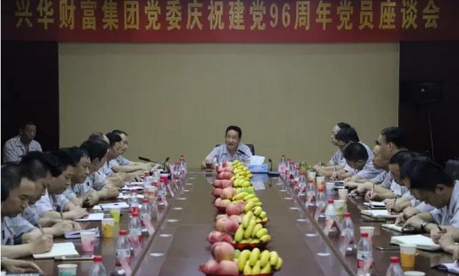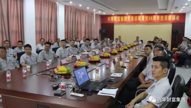 为缅怀党的光辉历程,讴歌党的丰功伟绩,进一步加强党史教育,抒发全体党员爱党情怀,6月30日下午,集团公司党委在一楼会议室隆重召开了庆祝中国共产党建党96周年党员座谈会。集团公司党委书记、董事长陈茂春,党委副书记、副总裁李福忠,集团公司副总裁兼兴华钢铁总经理付新岗出席此次会议。各支部全体党员整装一新、精神抖擞,大家欢聚一堂,共同庆祝中国共产党成立96周年。会议由党委副书记钟春华主持。