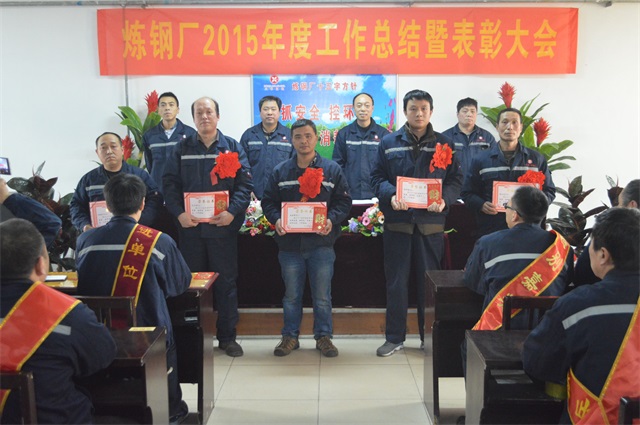 2016年1月2日下午炼钢厂2015年总结表彰大会在公司专家楼三楼会议室隆重召开,会上总结2015年各项工作,安排部署2016年的奋斗目标和任务,奖励表彰为炼钢厂生产和发展做出显著成绩的先进集体和个人。公司生产副总付新岗、炼钢厂长曹毅、生产副厂长崔岗元、设备副厂长林绍光及各车间、科室领导、获奖的全体人员和职工代表共计100多人参加此次会议。会议由设备副厂长林绍光主持。