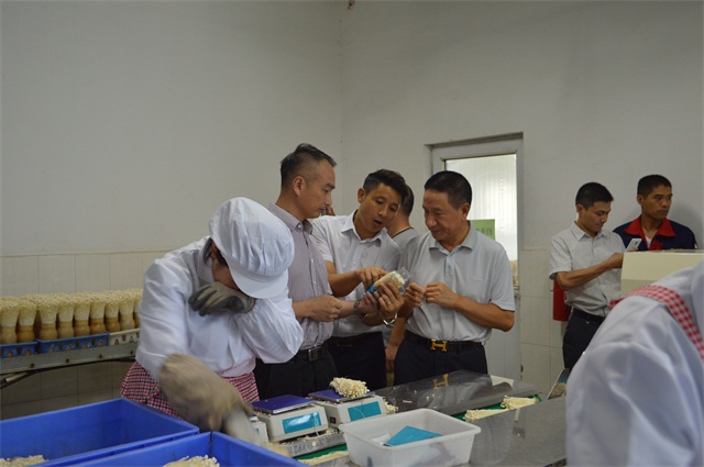 在考察期间,陈茂春董事长一行实地参观了金针菇整个生产工艺流程(包括配比拌料—自动装瓶—高温杀菌—自动接菌—恒温培养—出芽—成品包装),详细了解了其生产加工能力、生产周期、生产成本构成、销售利润率、物流运费等情况,山东友和菌业林总及公司技术人员一一作了解答,并介绍了金针菇、香菇两个品种的市场发展前景。