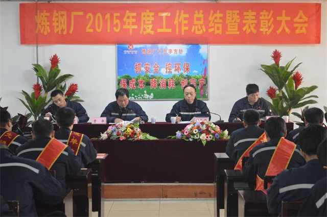2016年1月2日下午炼钢厂2015年总结表彰大会在公司专家楼三楼会议室隆重召开,会上总结2015年各项工作,安排部署2016年的奋斗目标和任务,奖励表彰为炼钢厂生产和发展做出显著成绩的先进集体和个人。公司生产副总付新岗、炼钢厂长曹毅、生产副厂长崔岗元、设备副厂长林绍光及各车间、科室领导、获奖的全体人员和职工代表共计100多人参加此次会议。会议由设备副厂长林绍光主持。