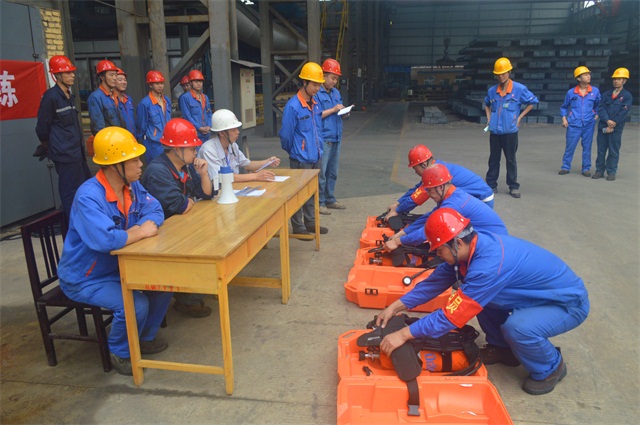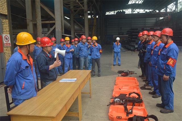 为贯彻落实集团集团公司安全生产月有关煤气安全生产的重要指示精神,切实加强轧钢厂安全生产工作,提高全员安全意识,提高轧钢厂对生产安全事故的应急处置组织能力和员工防范、应对突发事故的能力,通过演练使人员掌握应急救援运行程序和方法,提高各专业队伍协调作战的能力,使事故控制在最低限度,确保轧钢厂今后的安全生产。2015年6月26日上午,轧钢厂型钢轧钢车间开展煤气中毒救援演练。轧钢厂厂长韩宗涛、设备副厂长李海东、贯标中心副主任郑小凯、型轧车间林鑫、主任助理杨锋、安防处煤气防护站站长吕学芬观摩指导此次演练。