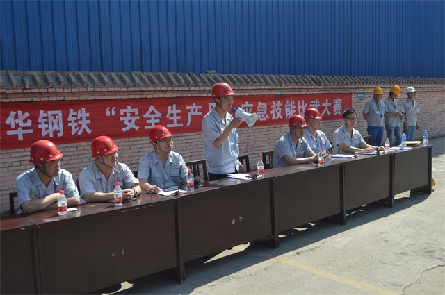 比赛前由安全处长黄强宣读了此次比赛的目的、注意事项以及相关事宜。此次大赛是公司以全国第十四次安全生产月活动为契机,以《国务院关于进一步加强企业安全生产工作的通知》、《河北省安全生产应急管理规定》为指导,深入贯彻安全生产月主题“加强安全法治、保障安全生产”。按照我公司安全生产应急管理工作统一安排部署,开展以“比技能、提素质、保安全”为主题,以提升应急处置能力为目地。公司炼铁厂、炼钢厂、轧钢厂三个单位演练比武,以提升我公司专、兼职应急救援队伍综合素质,为我公司安全生产工作提供有效保障。