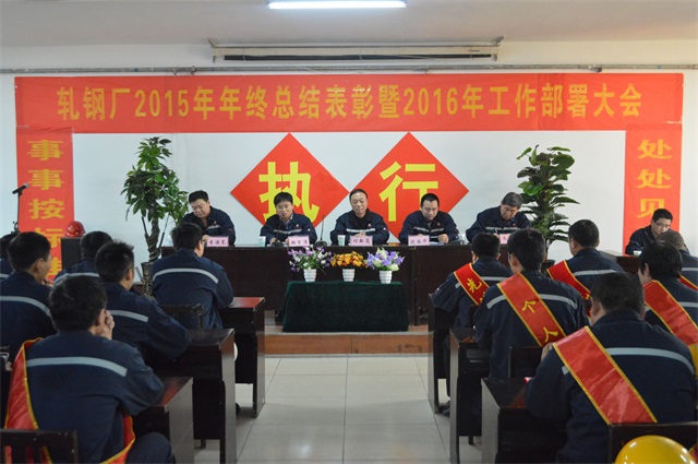 轧钢厂厂长韩宗涛作总结发言,分析了当前的钢铁形势,总结了轧钢厂一年来取得的成绩,指出了当前存在的共性问题,提出了2016年轧钢厂工作重点。他讲到,过去的一年是轧钢厂稳步发展,不断进取的一年,我们轧钢厂的每一位干部员工都能顶住当前严峻形势的压力,为轧钢厂发展付出了辛勤劳动和汗水,在工作中能够不断总结经验教训,在各方面都取得了很大的进步,新的一年,市场的形势会更加严峻,激励我们前进的目标还有很多。我们要明确目标、制定发展规划和措施、相信新的一年轧钢厂在公司的正确领导下,干部员工团结一心,共同努力,一定会谱写出轧钢更加辉煌绚丽的新篇章。生产副总付新岗对轧钢厂一年来取得的优异成绩表示祝贺,对轧钢厂2016年的工作提出三高一低一平安(高标准、高质量、高产量、低成本、平平安安)的期望和要求。