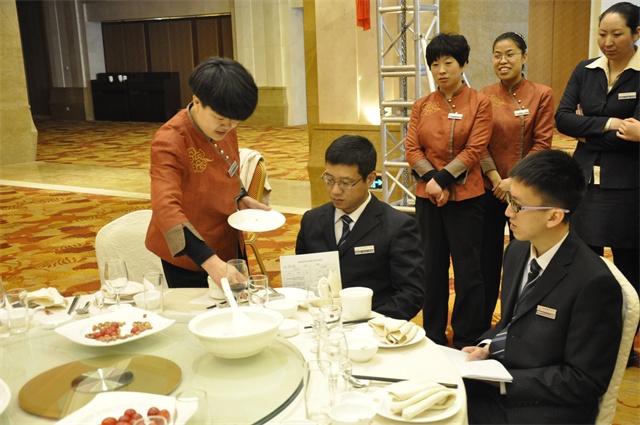 为了提升员工整体素质,不断增强服务质量,同时也为了进一步激励员工的工作热情,提高服务员的操作技能和服务水平,在酒店领导的大力支持及餐饮楼面部员工的积极参与下,财富国际酒店开展了首届楼面部员工技能能手大赛。此次比赛分为两个部分——笔试部分和实际操作部分,主要针对员工仪容仪表、礼节礼貌、摆台操作和基本的对客服务技能方面进行考评。